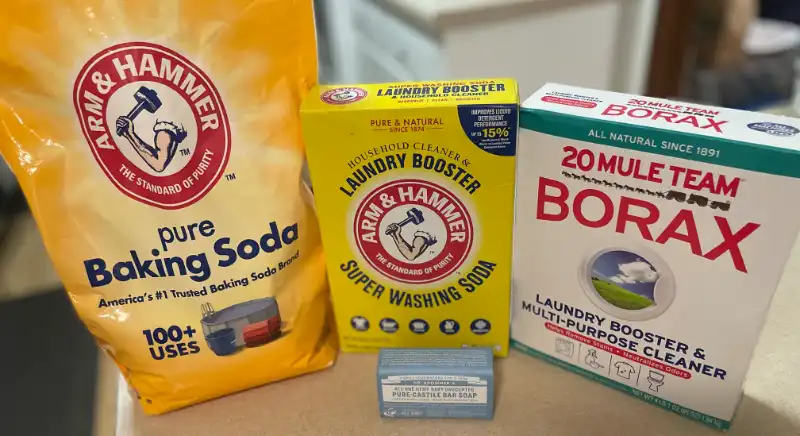 Note: the recipe uses roughly equal amounts of Baking Soda, Washing Soda, and Borax; precise measuring is not necessary - just use roughly equal amounts of each